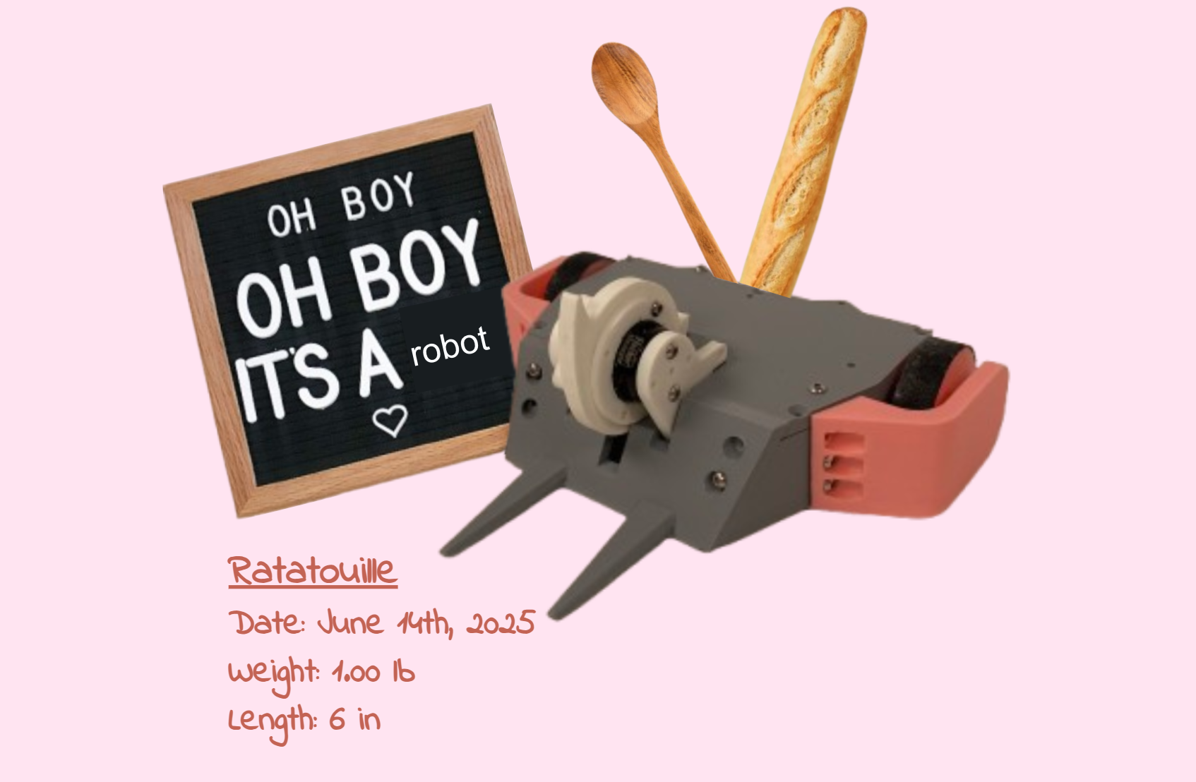 A lesson I take away from Ratatouille is to never underestimate the importance of spacing for electronics. Everything looks so much larger in CAD, and it's not quite possible yet to CAD wires in a conducive way, so my first attempts to run Ratatouille were very futile since it could not fit all of the electronics inside. With a quick redesign, I was able to adjust without exceeding the 1lb weight limit.
