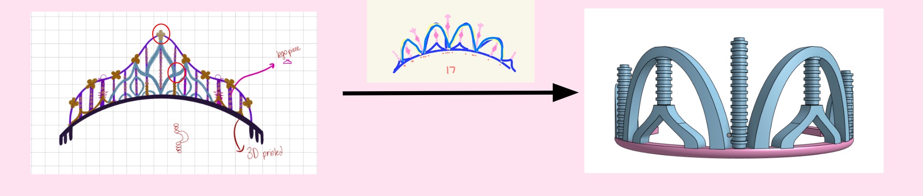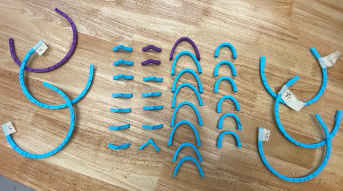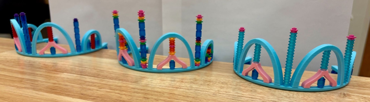 In our lab, we printed with an Ender 3 to fabricate our tiara. Working with Ender 3s gave us the opportunity to master and understand 3D print settings since we needed accurate LEGOx3D-print press-fit interfaces. We manipulated the infill pattern, Z-seam alignment, print orientations, layer height, and support type to perfect our intricate dome-shaped pieces. Take a look at our prototypes!