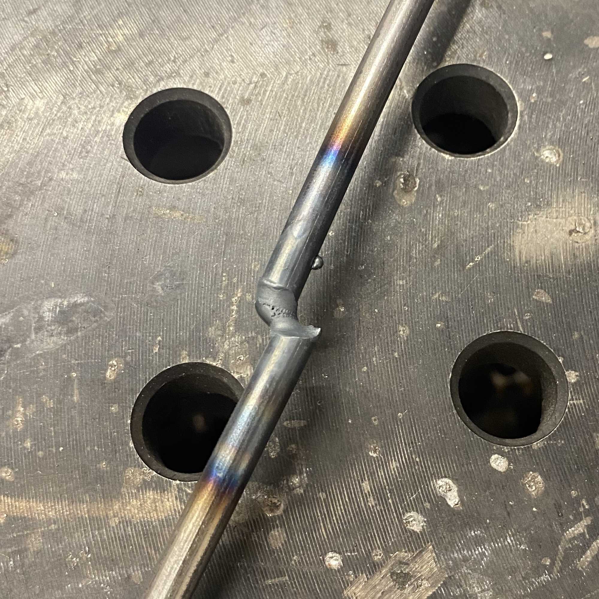 With some additional behind-the-scenes cutting, bending, and rolling for my other pieces, I was ready to start welding. My biggest challenge was learning the sensitivity of the TIG foot pedal, which controls the amperage (and thus heat) applied to the metal. A heavy foot on the pedal during stem welding resulted in what I can only describe as “blowing up in my face.” The heat was too intense for the thin rod, and it very uniquely split, emitting a cloud of sparks.