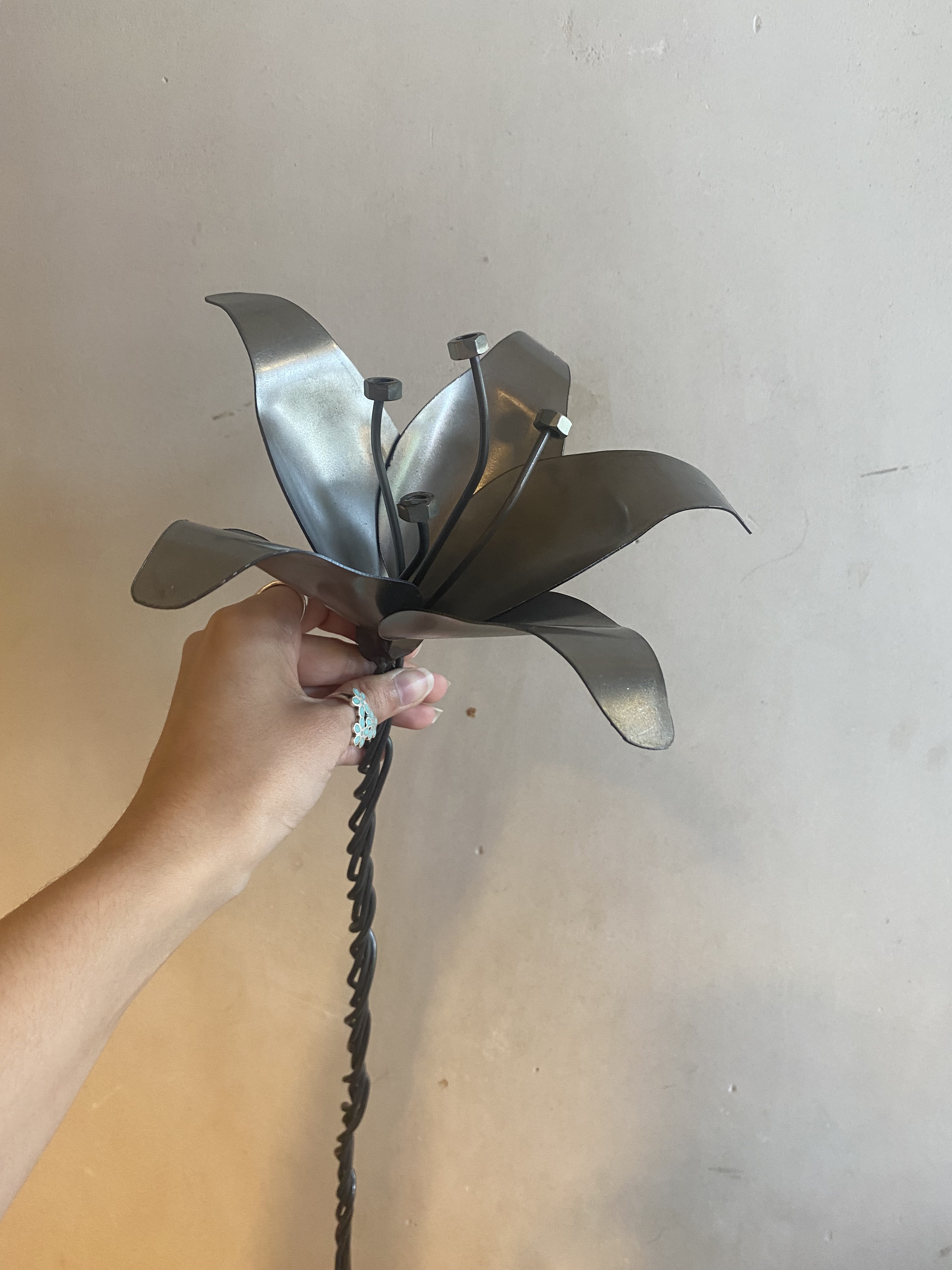 Lilies are my mom’s favorite flower, so it was especially exciting to weld this masterpiece! I had ambitious intentions for this project: creating an intertwined stem. During this process, I learned how to use the Oxyacetylene blowtorch. I intermittently heated the thin rods and twisted them together, little by little. See the video below!