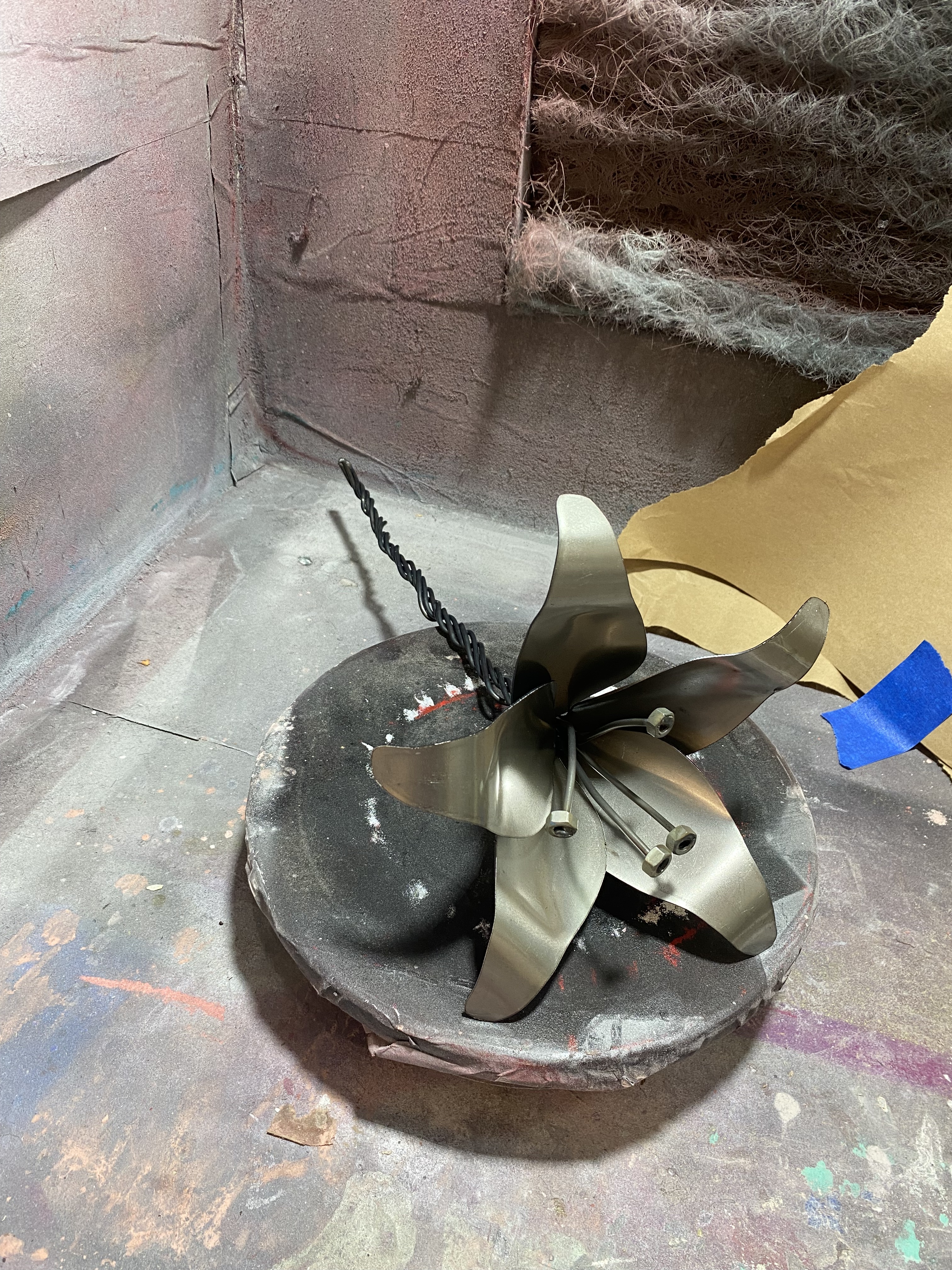 For the finishing details, I welded nuts on the ends of the rods to represent the anther of the flower. Since I was working with zinc-coated metal, I needed strong ventilation and a proper mask.